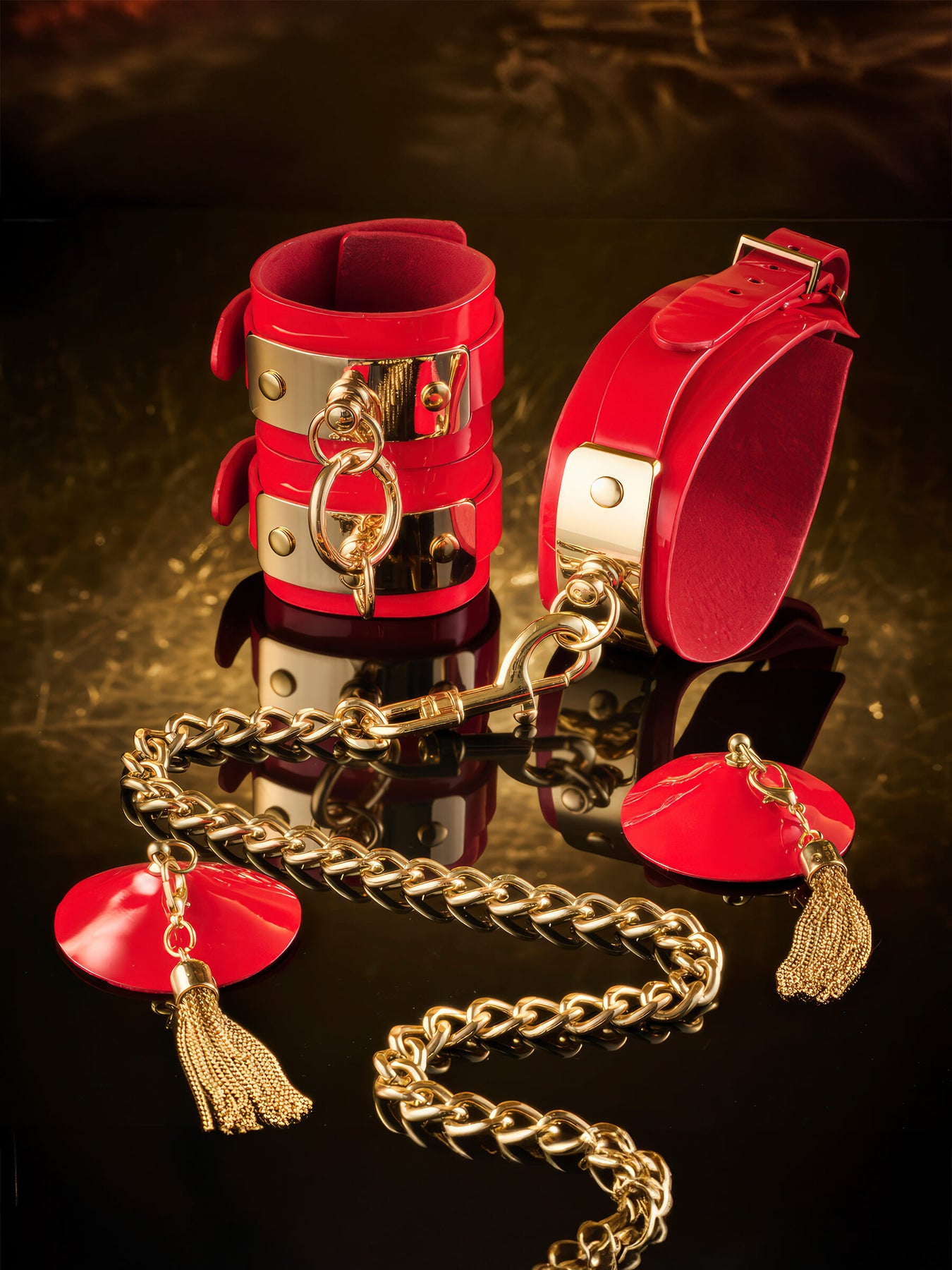 VEGAS – Hochglanz-Handfesseln aus veganem Leder (Rot) - Diese Designer-Handfesseln bestehen aus hochwertigem, hochglänzendem veganem Leder. Die goldene Metallplatte verleiht ihnen einen einzigartigen, luxuriösen Touch. Mit dem integrierten Clip-Ring lassen sich die Fesseln miteinander verbinden. Das Tragen dieser wunderschönen roten Handfesseln – der Farbe der Leidenschaft – stärkt dein Selbstbewusstsein. Sie sind für all jene geschaffen, die nicht nur neue Empfindungen erleben möchten, sondern auch mit Stil spielen oder diese atemberaubenden Accessoires öffentlich tragen wollen. In diesem Fall lassen sich die edlen Fesseln auch wunderbar mit anderen Accessoires kombinieren. Wo Verlangen die Dunkelheit trifft. Gib dich der Versuchung hin. Verliere dich in der Sünde.
