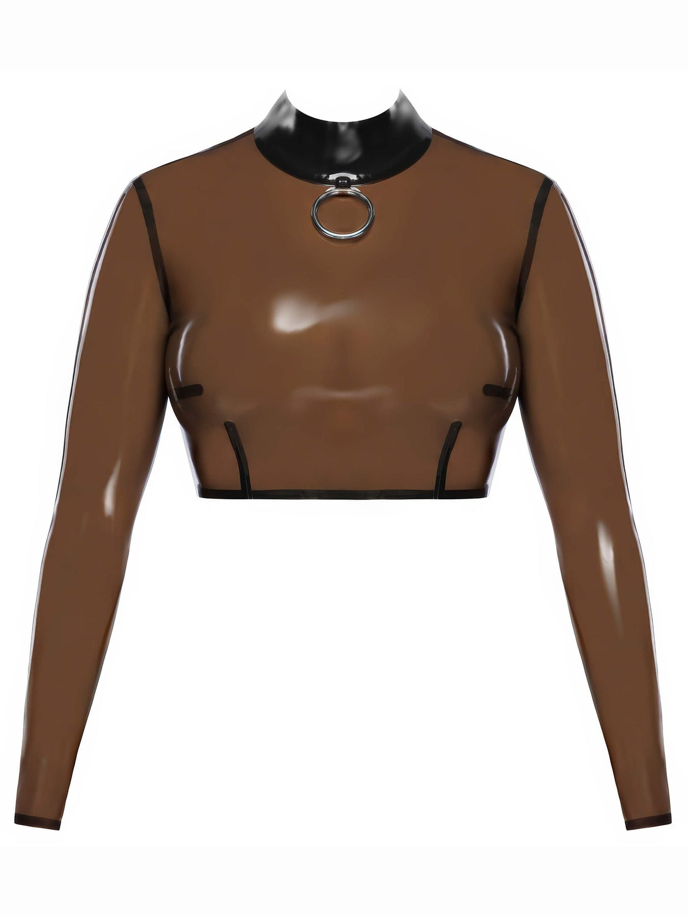 Latex Shirt, Aufregend schwarz transparent! Bauchfreies Langarm-Shirt von LateX aus Naturlatex (geklebt) in rauchfarbener Transparenz. Mit großem dekorativen Metallring vorne unter dem stilvollen Stehkragen. Im Rücken mit durchgehendem Reißverschluss für bequemes An- und Auskleiden.