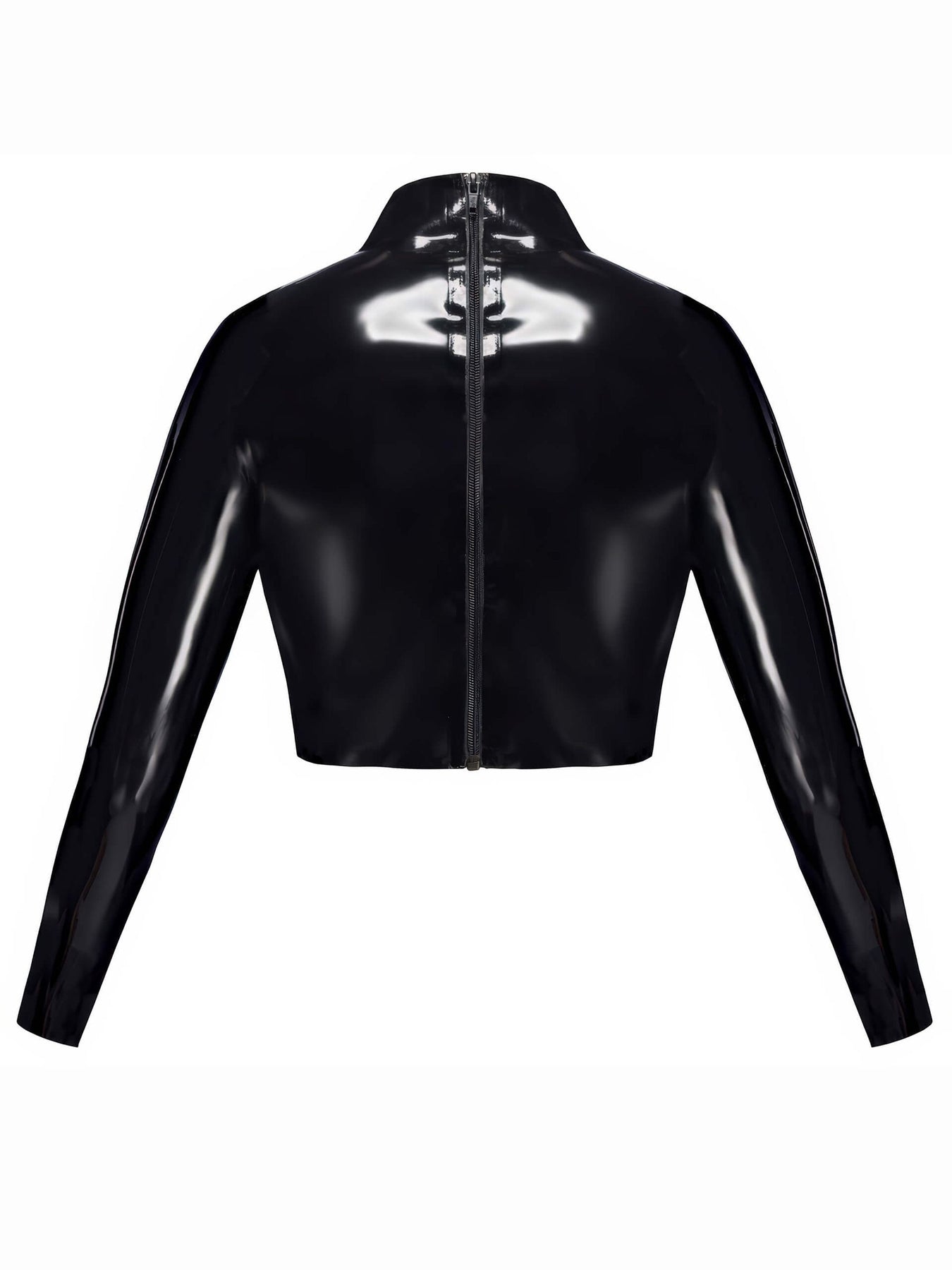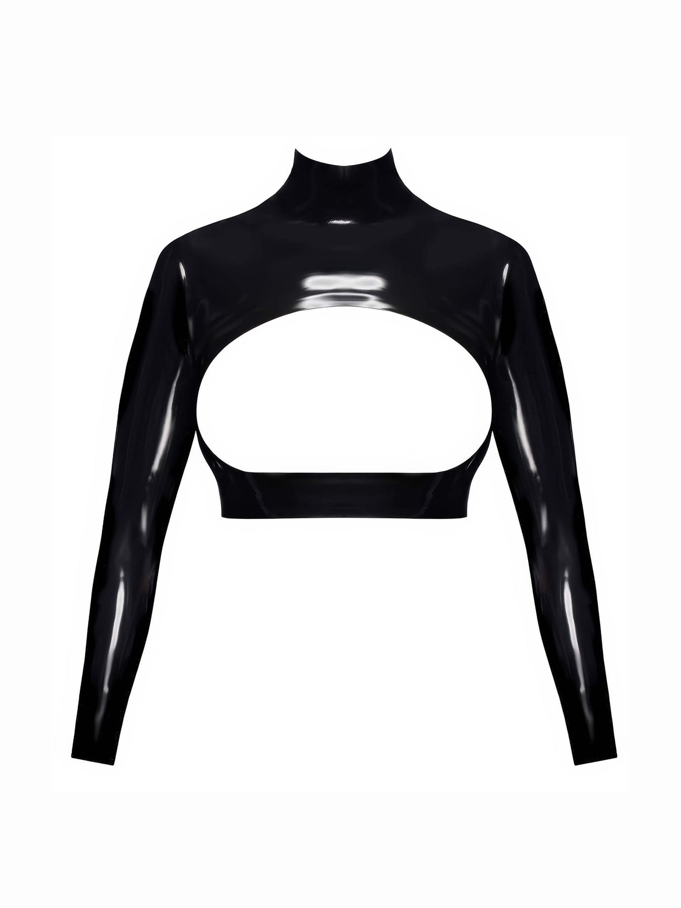 Topless Latex Shirt - Stilvoll busenfrei! - Bauchfreies Shirt von LateX aus schwarzem Naturlatex (Stärke 0,35 mm) mit großem Cut-out in der Front für eine atemberaubende Busen-Präsentation. Stilvoll elegant mit Stehkragen und langen Ärmeln. Im Rücken mit durchgehendem Reißverschluss für bequemes An- und Auskleiden.
