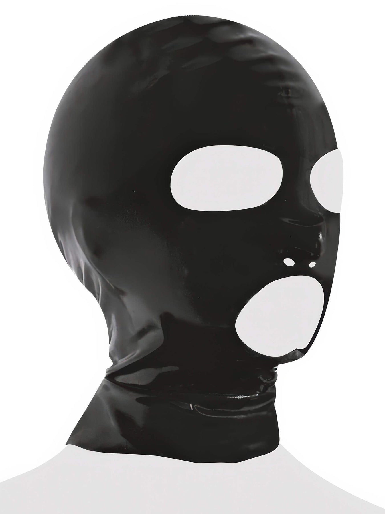 Das ultimative Accessoire für Rubber-Kenner:innen! Auf flacher Form getauchte Kopfmaske von LateX mit Öffnungen für Mund und Augen sowie Nasenlöchern.