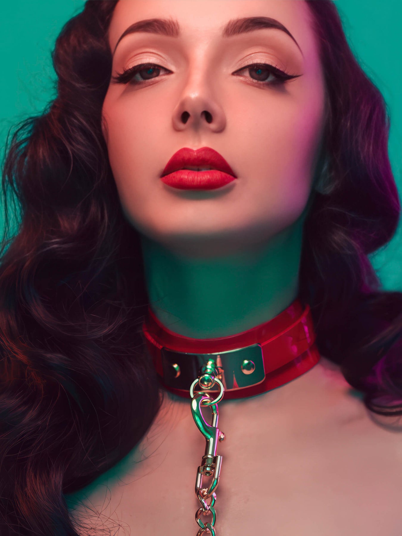 VEGAS – Hochglanz-Halsband mit O-Ring & Leine - Dieses edle Halsband besteht aus hochwertigem, hochglänzendem veganem Leder. Die goldene Leine mit Griff aus demselben Material führt die Submissive an den gewünschten Ort. Die goldene Metallplatte verleiht dem Halsband einen unverwechselbaren, luxuriösen Touch. Lass deiner Fantasie freien Lauf, erkunde neue Empfindungen und spiele mit Stil. Trage dieses atemberaubende Halsband auch in der Öffentlichkeit – und genieße die Aufmerksamkeit, die du verdienst. Wo Verlangen die Dunkelheit trifft. Gib dich der Versuchung hin. Verliere dich in der Sünde.