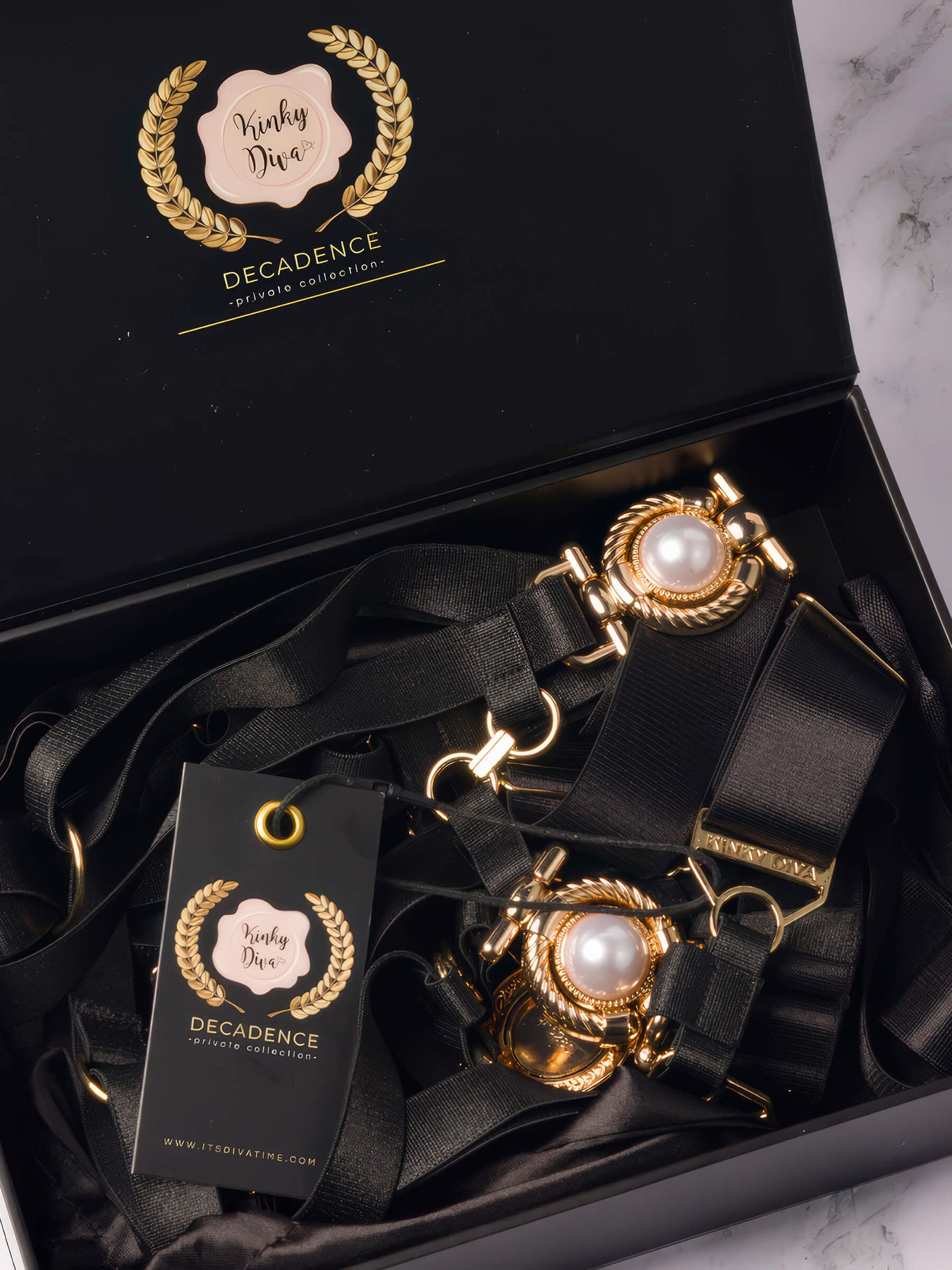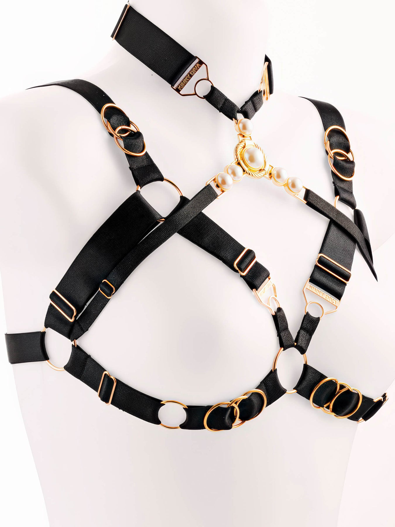 FAUSTINA I | 6 PERLEN – Cup-loser Triangel-BH / Cross Over Ein mutiges Design, das starke Weiblichkeit zelebriert. Die überkreuzten Träger rahmen die Brust auf elegante Weise und lassen die Cups offen für einen verführerischen Look. Gehalten und betont durch schimmernde Perlen, die in einem goldenen Dreiecksornament eingefasst sind. Dieses Stück vereint Eleganz mit einem Hauch von Opulenz. Verstellbare Träger mit dekorativen Ringen sorgen für Komfort und eine perfekte Passform – ein Design, das zugleich auffällig und raffiniert ist.