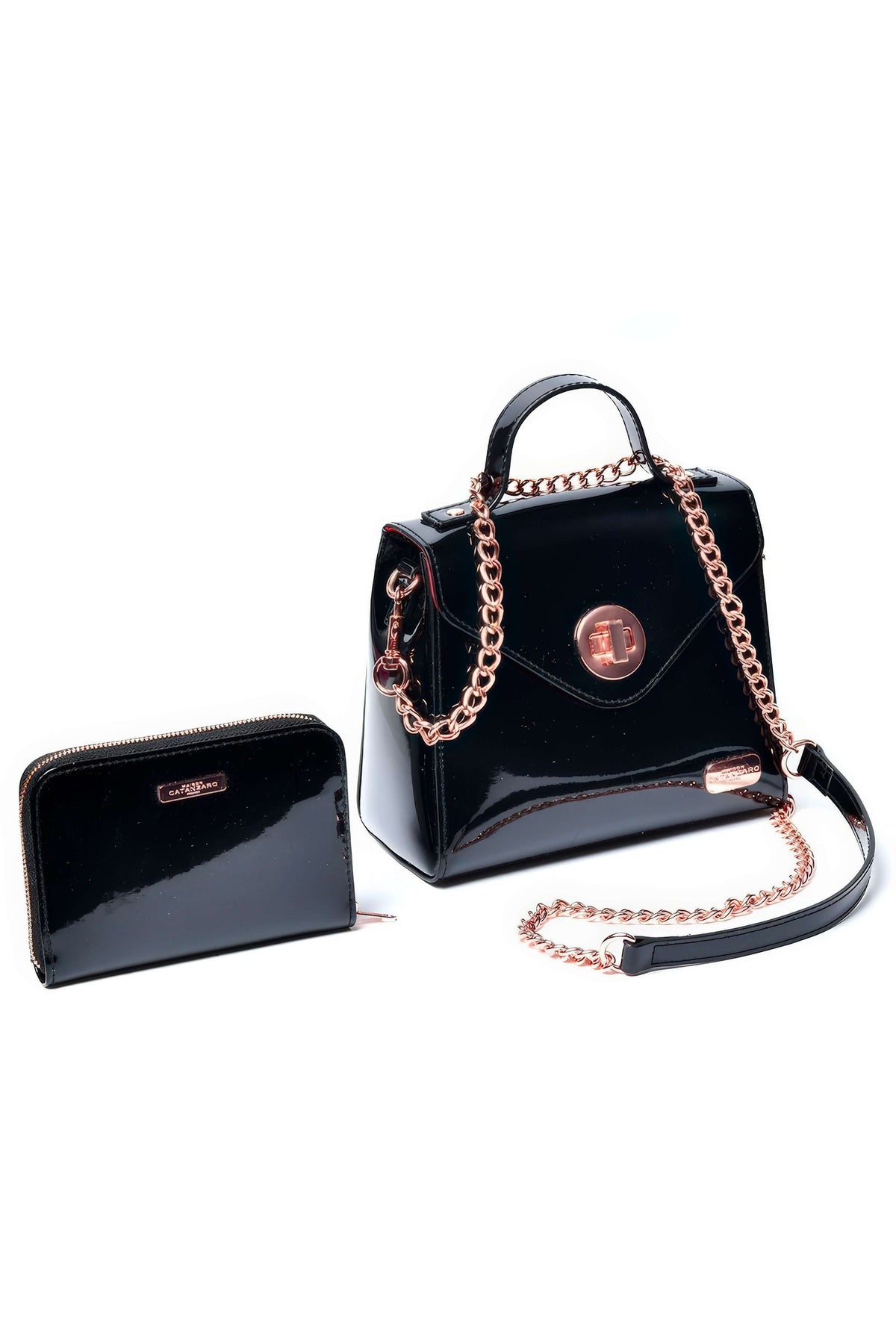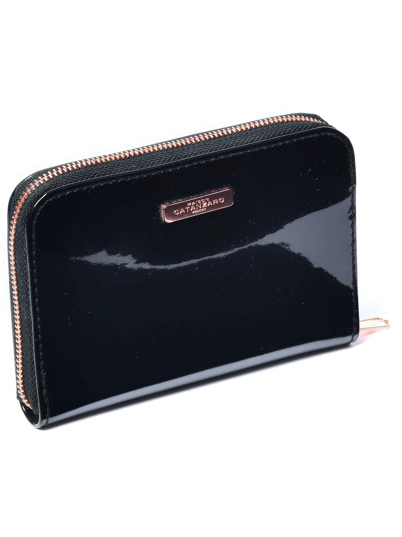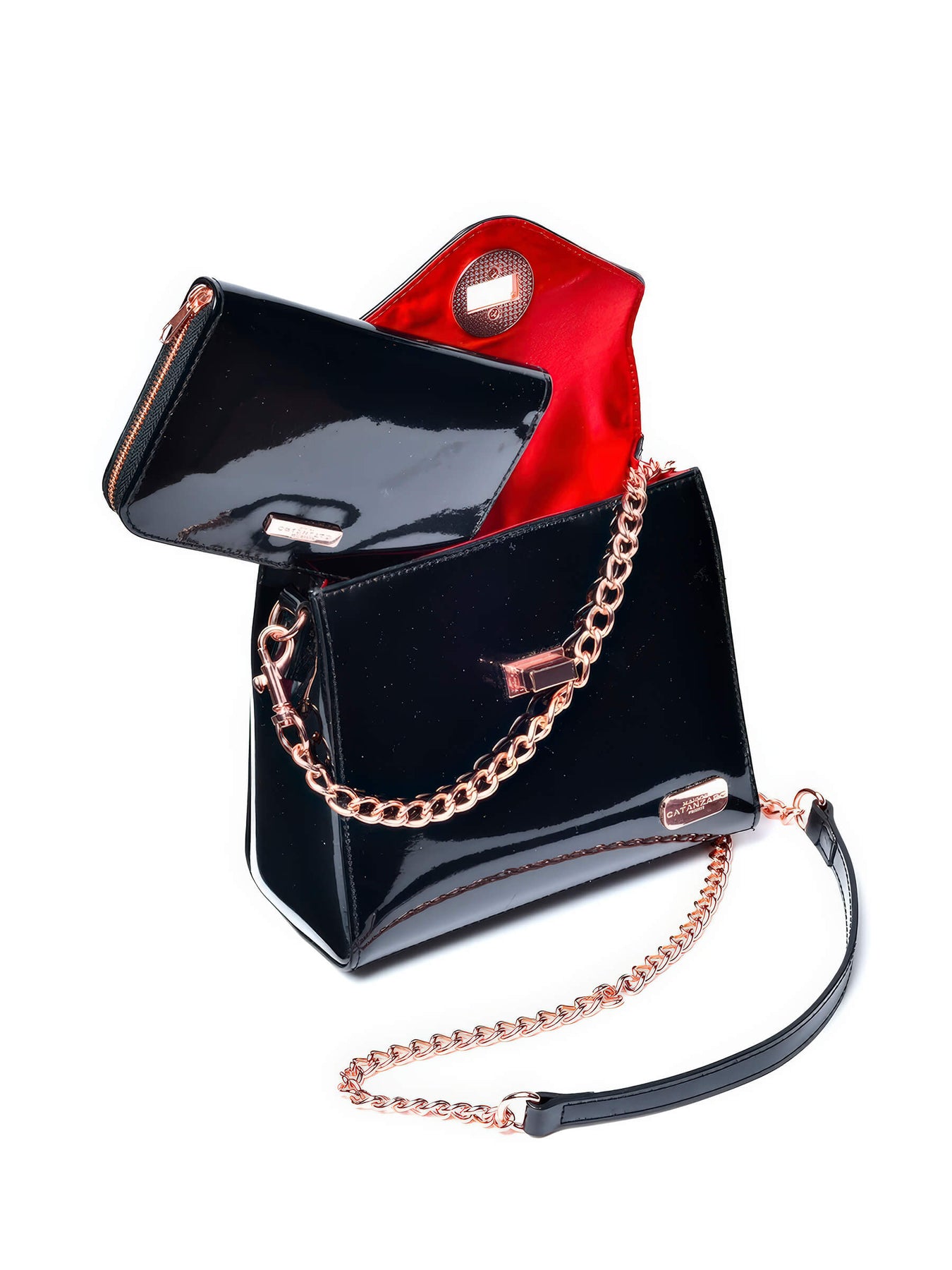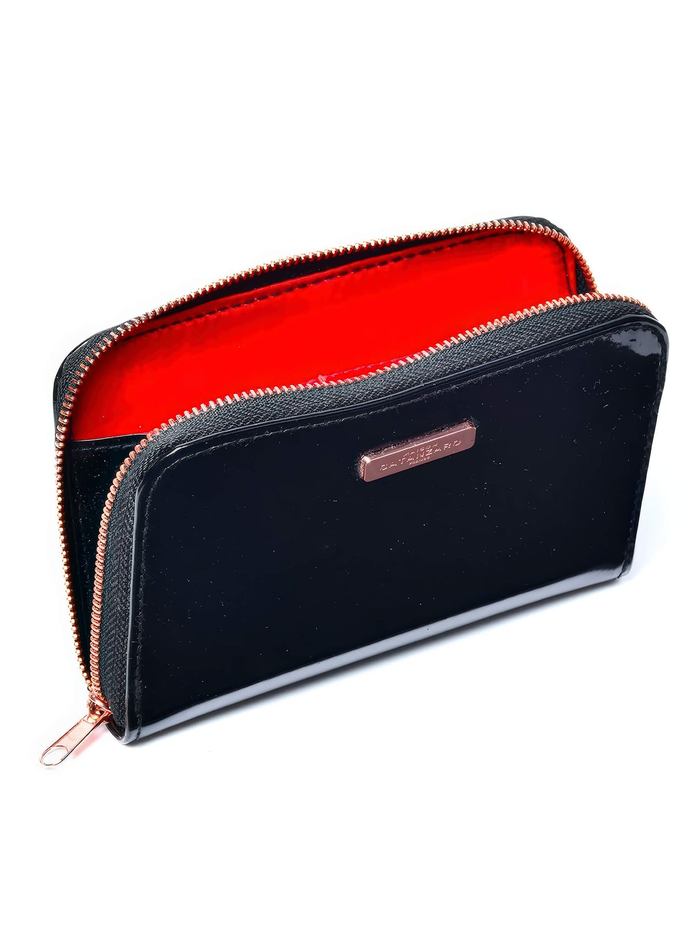 Schwarzes Lack Port Monnaoie Handtasche ist der ideale Begleiter zur jeder Fetischparty. Geldbörse aus schwarzem Vinyl, vollständig mit rotem Satin gefüttert.