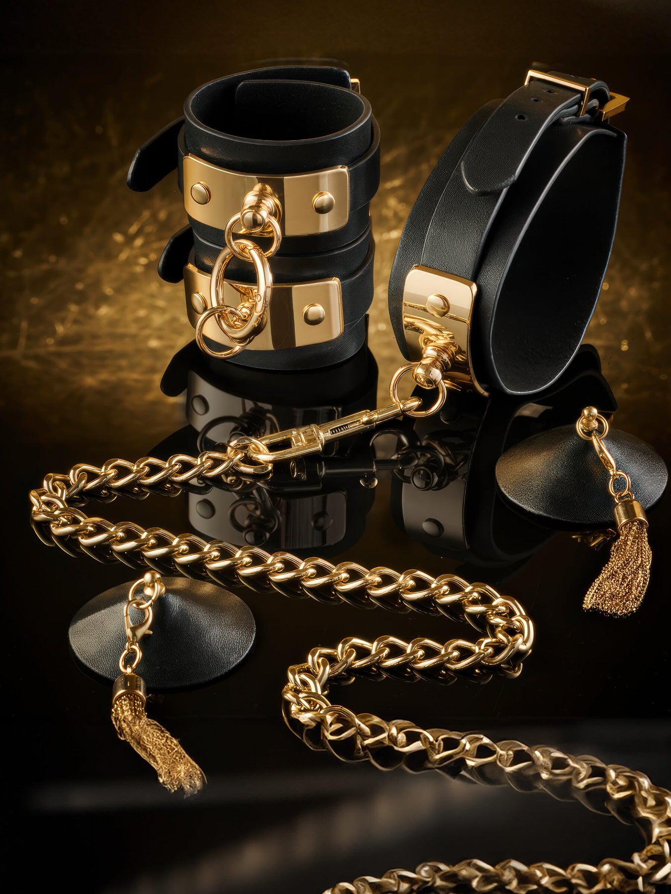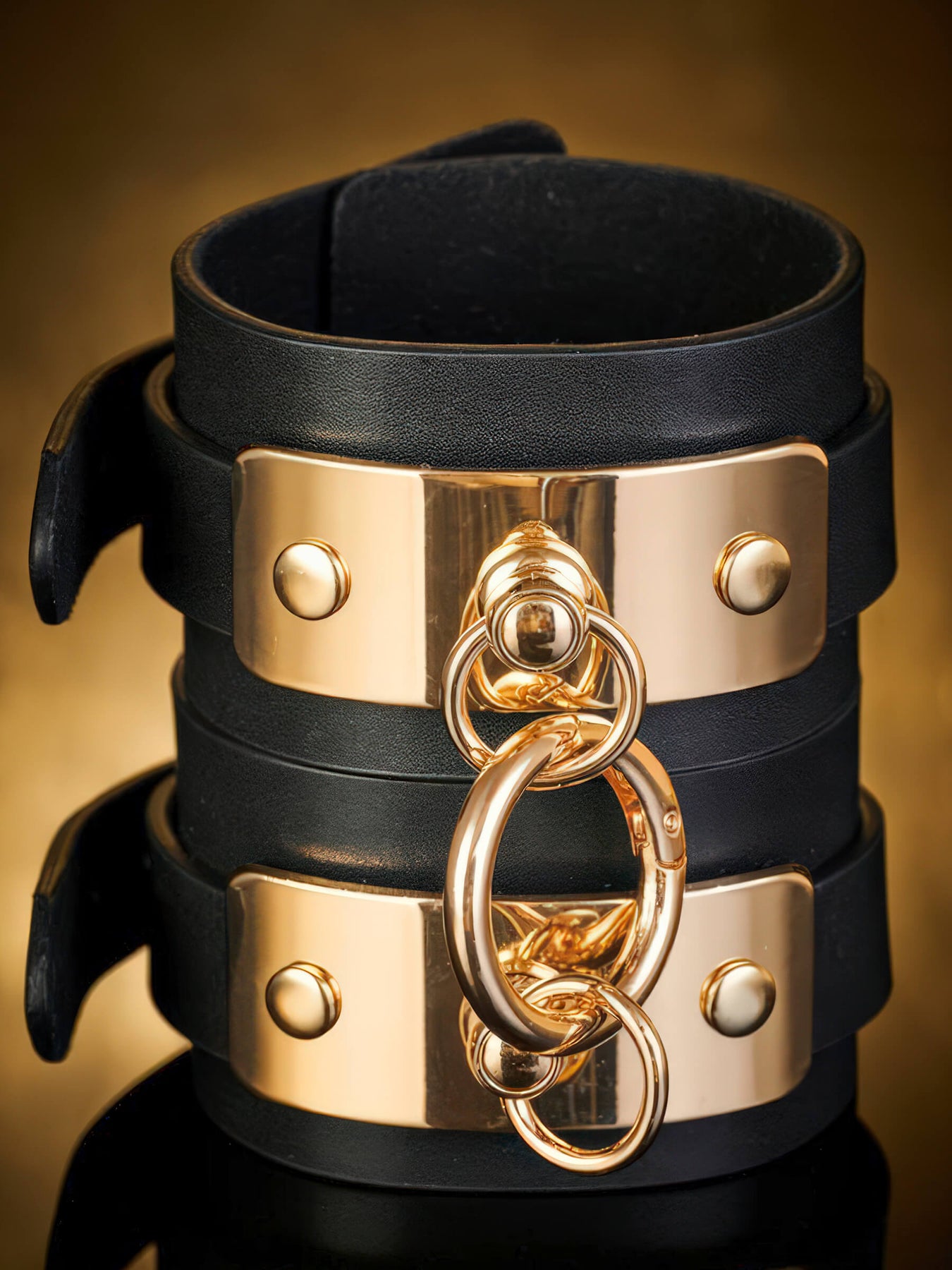 VEGAS – PU-Leder Knöchelfesseln mit Gold-Details - Diese Designer-Knöchelfesseln bestehen aus hochwertigem, veganem PU-Leder. Die goldene Metallplatte verleiht ihnen einen einzigartigen, luxuriösen Look. Mit dem integrierten Clip-Ring lassen sich die Fesseln elegant miteinander verbinden. Das Tragen dieser edlen Fesseln stärkt dein Selbstbewusstsein – sie sind geschaffen für all jene, die nicht nur neue Empfindungen erleben möchten, sondern auch mit Stil spielen oder diese atemberaubenden Accessoires öffentlich tragen wollen. In diesem Fall lassen sich die Fesseln wunderbar mit anderen Accessoires, wie Knöchelketten, kombinieren. Wo Verlangen die Dunkelheit trifft. Gib dich der Versuchung hin. Verliere dich in der Sünde.