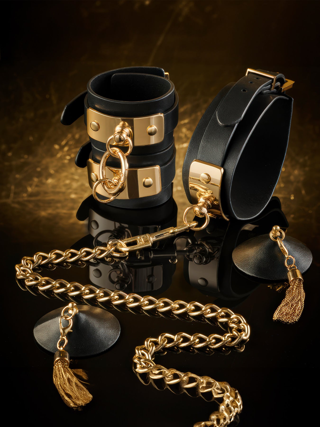 VEGAS – PU-Leder Handfesseln mit Gold-Details - Diese Designer-Handfesseln bestehen aus hochwertigem, veganem PU-Leder. Die goldene Metallplatte verleiht ihnen einen einzigartigen, luxuriösen Look. Mit dem integrierten Clip-Ring lassen sich die Fesseln elegant miteinander verbinden. Das Tragen dieser edlen Fesseln stärkt dein Selbstbewusstsein – sie sind geschaffen für all jene, die nicht nur neue Empfindungen erleben möchten, sondern auch mit Stil spielen oder diese atemberaubenden Accessoires öffentlich tragen wollen. In diesem Fall lassen sich die Fesseln wunderbar mit anderen Accessoires kombinieren. Wo Verlangen die Dunkelheit trifft. Gib dich der Versuchung hin. Verliere dich in der Sünde.
